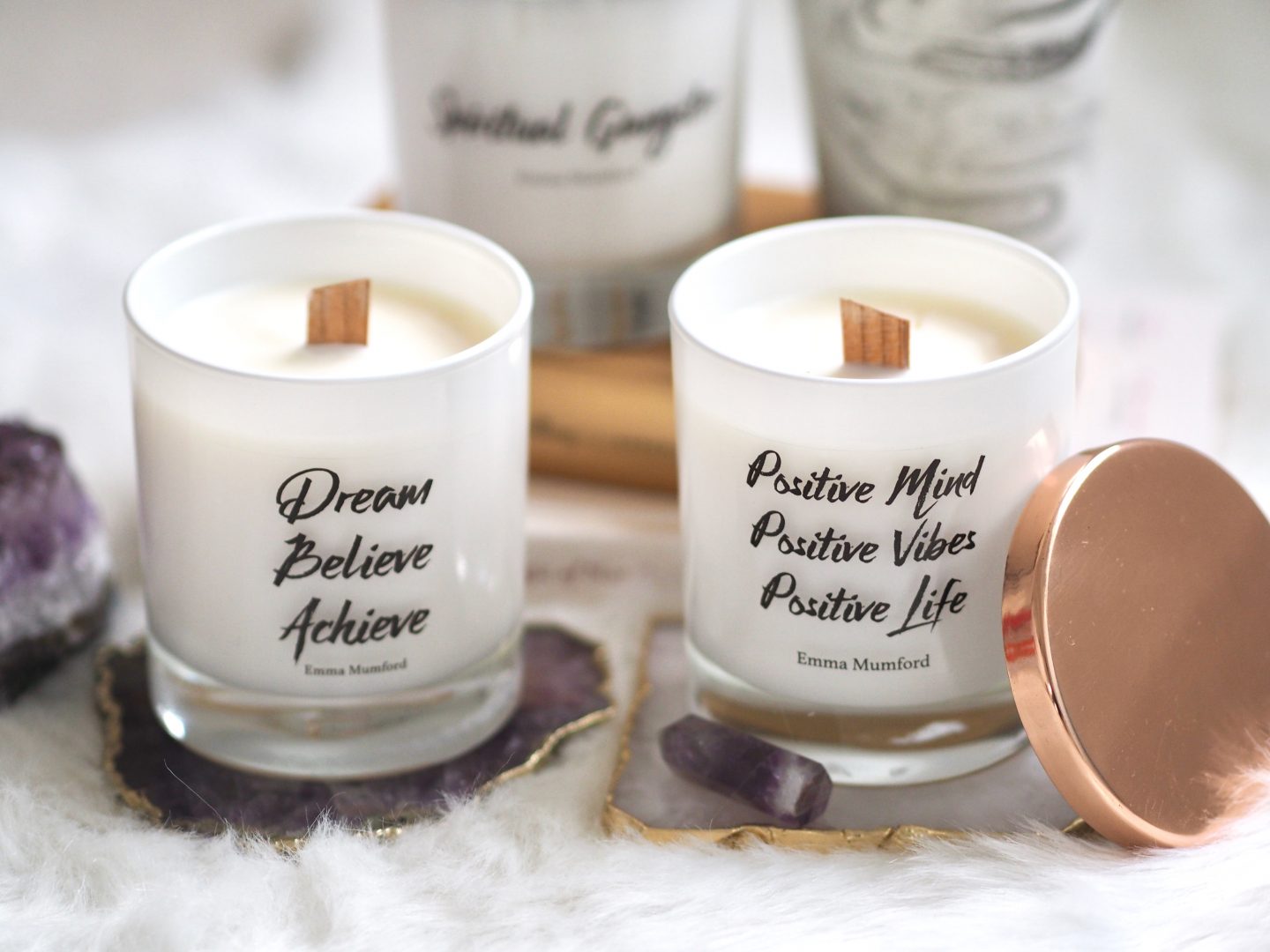 When designing this range, I wanted to create uplifting candles and continue to give you all inspiration when manifesting and positivity in your daily lives. I wanted you to be able to pick up these candles feel uplifted by the positive quotes and light it knowing your wishes will be fulfilled. I also chose wooden wicks for my candles as I feel they burn better, and really add a luxurious touch. You also get a silver, copper or gold lid with your candle and a dust bag, so if you’re like me and use your candles for decoration then these lids add the perfect touch.