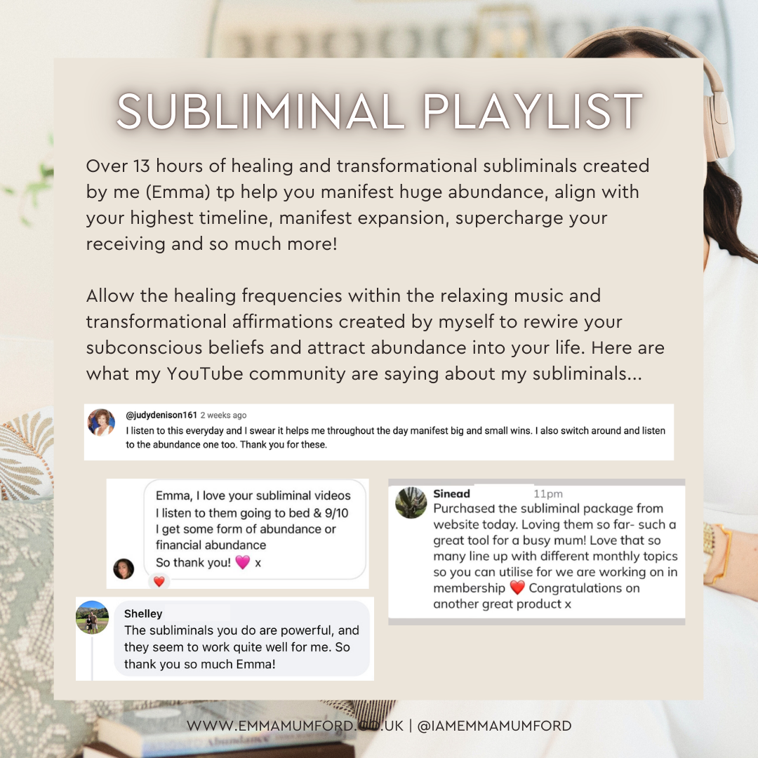 Over 13 hours of healing and transformational subliminals created by me (Emma) to help you manifest huge abundance, align with your highest timeline, manifest expansion, supercharge your receiving and so much more! This subliminal playlist has come highly requested after the great success of my subliminals over on my YouTube channel. Now you have access to your favourites ad free and brand new, unreleased tracks too. All files will be able to be downloaded once checkout has been completed on the webpage and an email will be sent to you also (please check your junk/spam folder first if you can’t find it). Please note we recommend downloading these mp3 files onto a computer or laptop first then importing them onto a chosen device. You can also save them directly to your Dropbox account (app) from a mobile device.