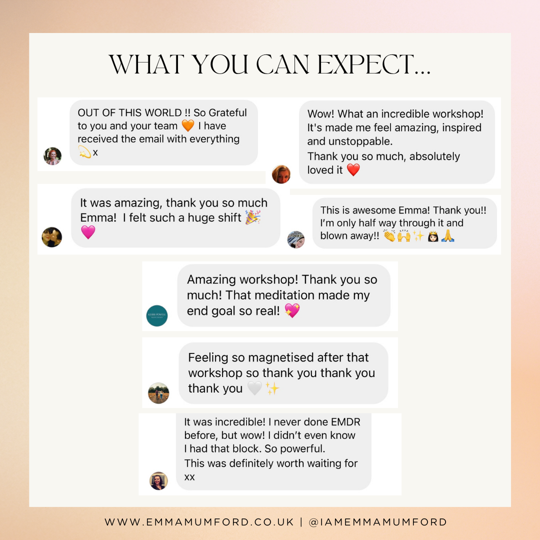 Please note this is a digital purchase and upon successful checkout, you will receive the link to Emma’s masterclass replay to watch, enjoy and keep in your own time. The masterclass includes 4 focused areas of tools, techniques and a powerful melting your upper level limit blocks meditation and IEMT session at the end including a Q&A.